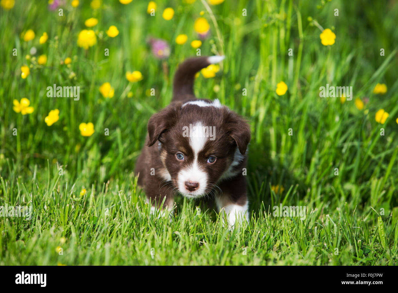Miniature American Shepherd Oder Miniature Australian Shepherd Oder Mini Aussie Welpen Red Tri In Blumenwiese Stockfotografie Alamy